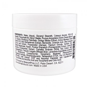 Ingredients: Water (Aqua), Glyceryl Steareth, Cetearyl Alcohol, PEG-100 Stearate, Polysorbate 60,Decyl Oleate, Prunus Amygdalus Dulcis (Sweet Almond) Oil, Glycerin,Ethylhexyl Palmitate, Ginkgo Biloba Extract, Aloe Barbadensis Extract, Bentonite, Octanoic Acid, Olea Europaea (Olive) Leaf Extract, Propanediol (Zemea), Titanium Dioxide, Xanthan Gum, Stearyl Heptanoate, Kaolin, Punica Granatum (Pomegranate) Extract, Camomilla Recutita (Chamomile) Extract, Camellia Sinensis (White Tea) Extract, Arnica Montana Flower Extract CO2, Alpha Oligopeptide-6, Triticulm Vulgare (Wheat) Bran, Lavandula Angustifolia (Lavender) Oil, Dimethicone Crosspolymer, Tocopherol, Bisabolol, Phenoxyethanol, Potassium Sorbate, Ethylhexylgycerin, Tetrasodium ETDA, Oxy CA (Rosmarinus Officinalis Leaf Extract CO2 and Ascorbyl Palmitate and Caprylic/Capric Triglycerides and Ascorbic Acid and Tocopherol and Citric Acid.