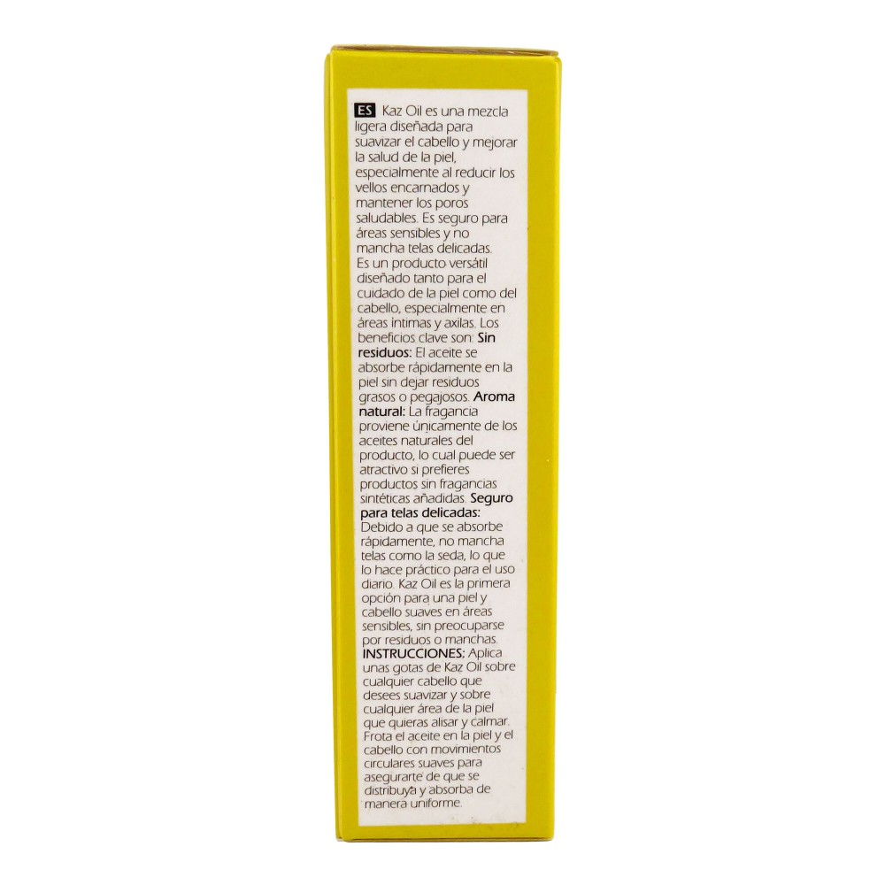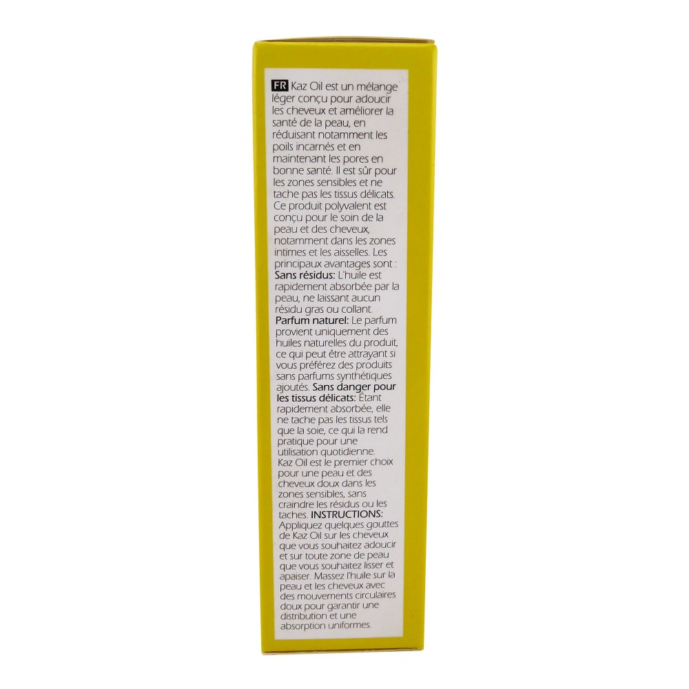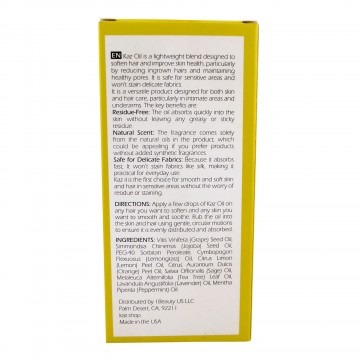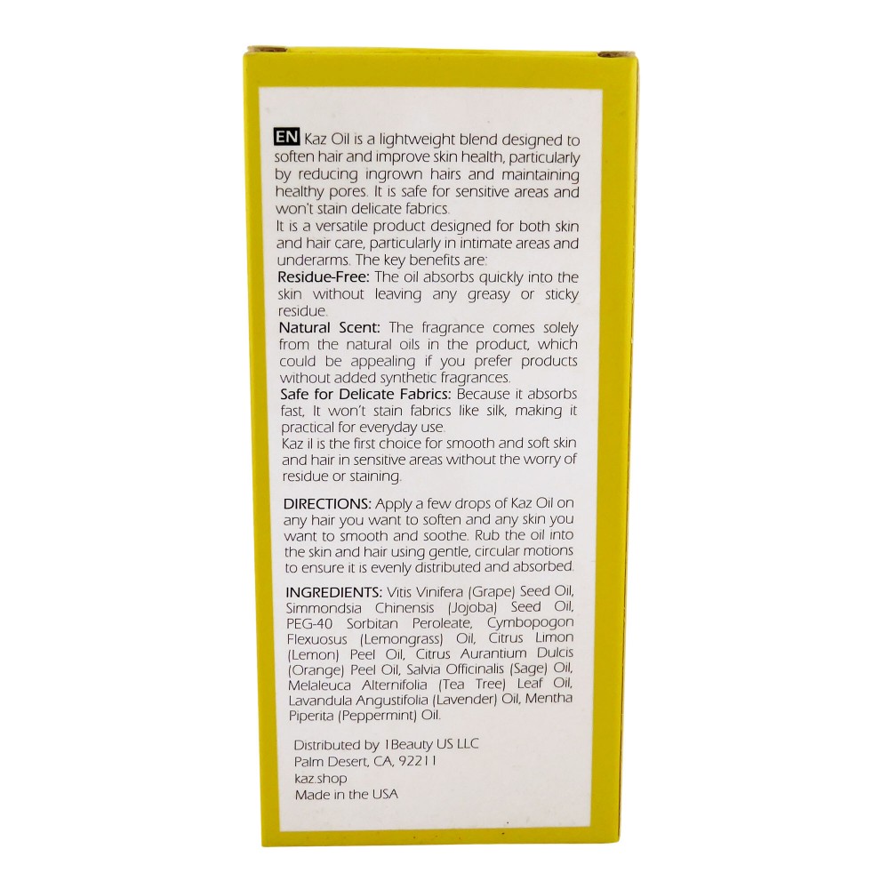 Kaz Oil is a lightweight blend designed to soften hair and improve skin health, particularly by reducing ingrown hairs and maintaining healthy pores. It is safe for sensitive areas and won't stain delicate fabrics.