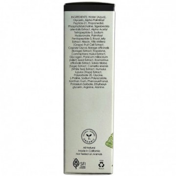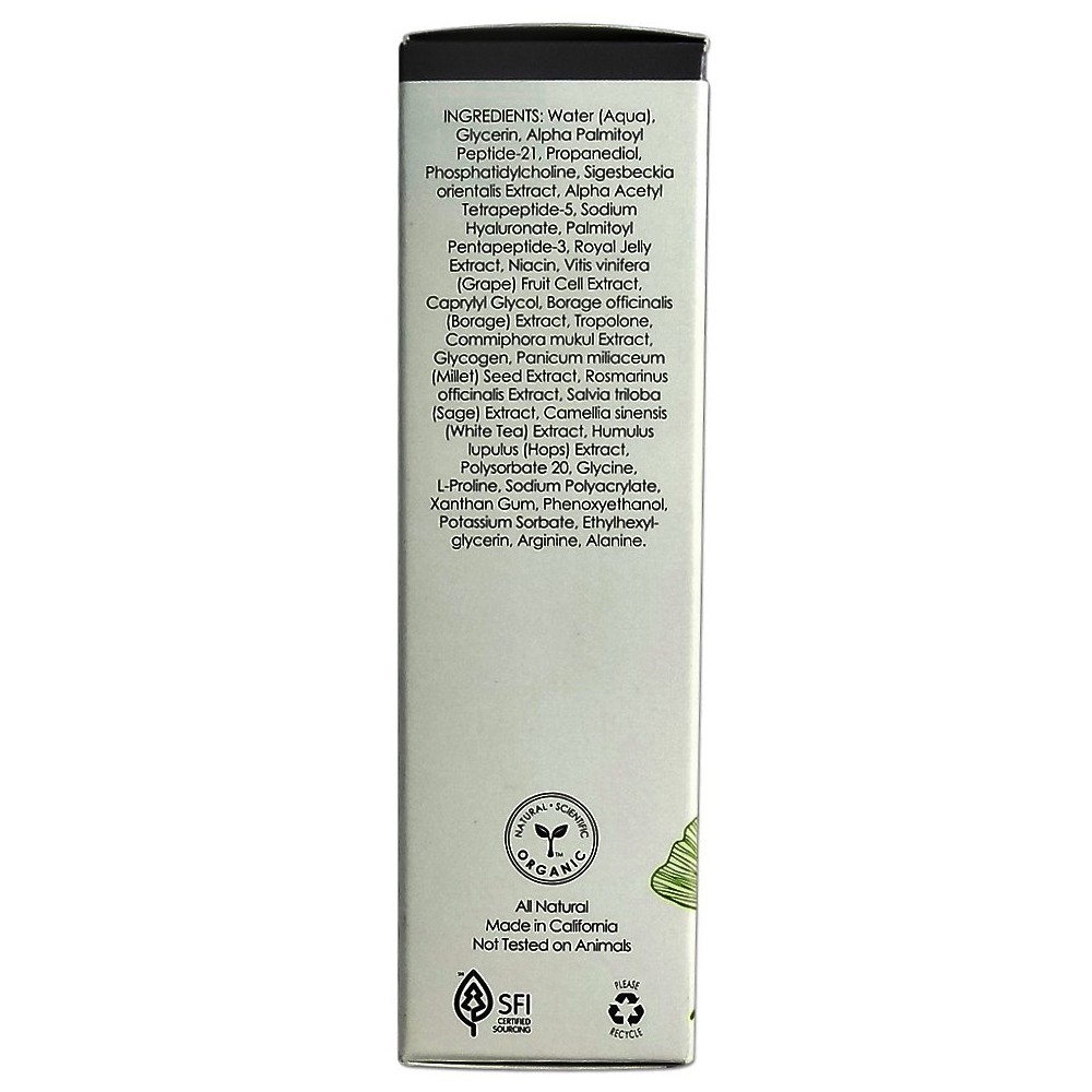 Water (Aqua), Glycerin, Alpha Palmitoyl Peptide-21, Propanediol, Phosphatidylcholine, Sigesbeckia orientalis Extract, Alpha Acetyl Tetrapeptide-5, Sodium Hyaluronate, Alpha Palmitoyl Pentapeptide-3, Royal Jelly Extract, Niacin, Vitis vinifera (Grape) Fruit Cell Extract, Caprylyl Glycol, Borage officinalis (Borage) Extract, Tropolone, Commiphora mukul Extract, Glycogen, Panicum miliaceum (Millet) Seed Extract, Rosmarinus officinalis Extract, Salvia triloba (Sage) Extract, Camellia sinensis (White Tea) Extract, Humulus lupulus (Hops) Extract, Polysorbate 20, Glycine, Proline, Sodium Polyacrylate, Xanthan Gum, Phenoxyethanol, Potassium Sorbate, Ethylhexylglycerin, Arginine, Alanine.